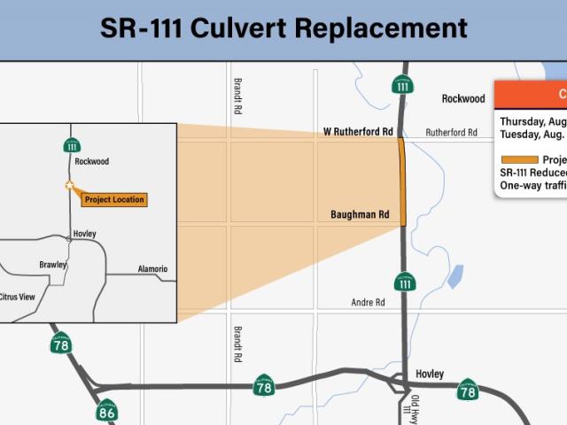 EL CENTRO, Calif. — Maintenance Construction crews will reduce northbound and southbound State Route 111 (SR-111) to one lane between West Rutherford and Baughman roads located north of the city of Brawley beginning Thursday at 8 p.m. through Tuesday, Aug. 9 at 8 p.m. according to Caltrans. The five-day closure is needed for culvert repairs that will require digging beneath the roadway.
